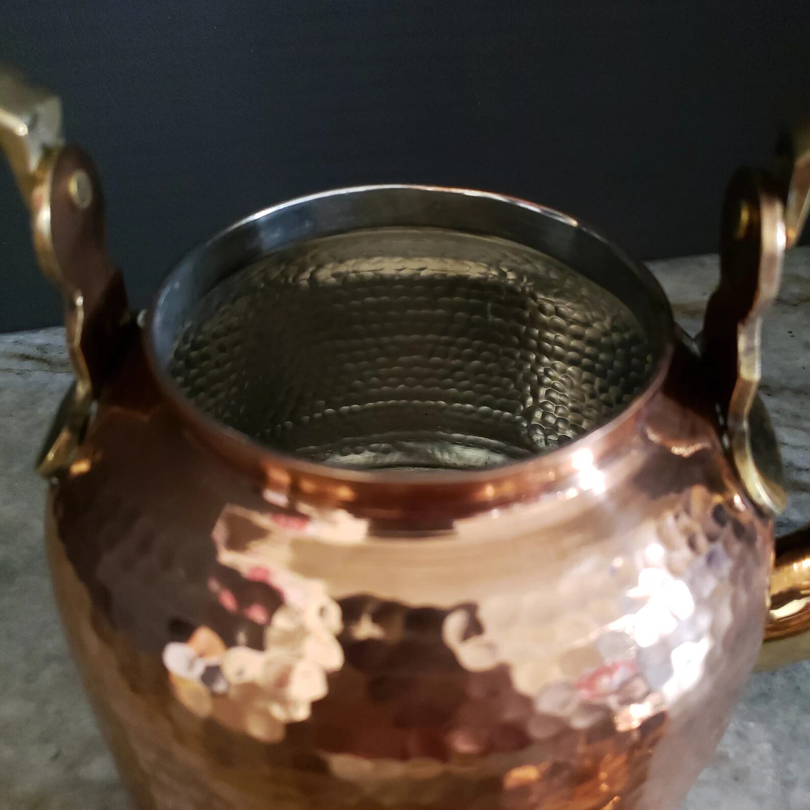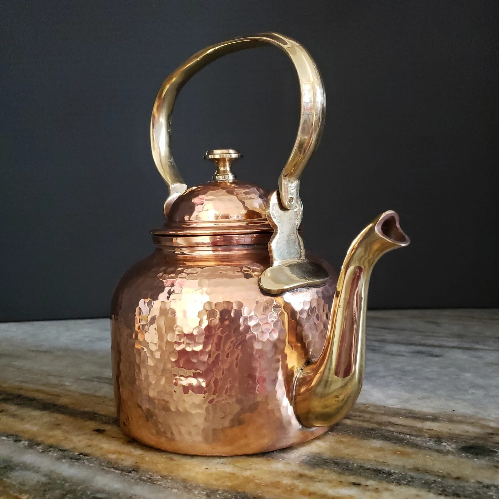 Hand Hammered Copper Kettle With Brass Handle And Spout which is made in Indian state Rajasthan by local artisans. This kettle is perfect for making and serving tea and coffee and the interior is lined with food-safe tin. Holds 1.0 Ltr or about 34 Fluid Ounces.